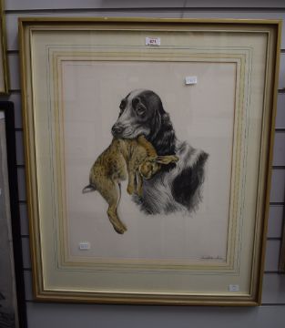 After Léon Danchin (French 1887- 1938) Lithograph of an English Setter with rabbit, printed signature to lower right, within washline mount and moulded gilt frame, under glass 43cm x 53cm & 63.5cm x 76.5cm overall.