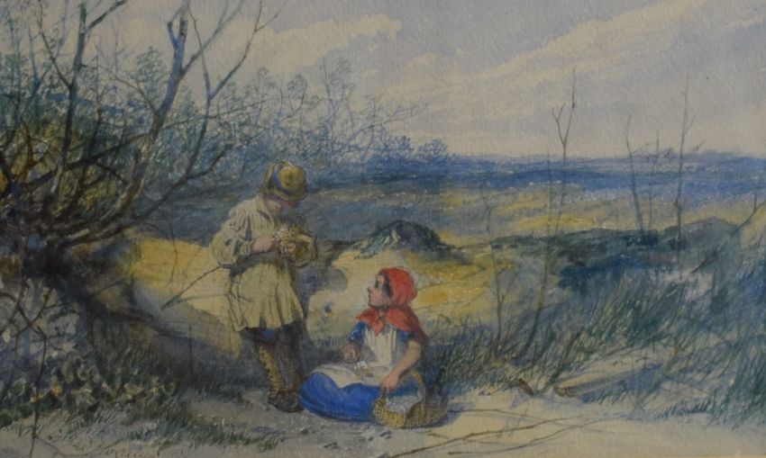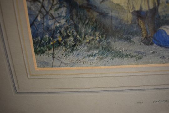 Fredrick Holding (1817 - 1874) watercolour, a couple resting beside a fallen tree, signed lower left, attributed along with artist's birth/death years to lower centre mount, within washline mount and gilt frame under glass, 24.5cm x 15cm & 42cm x 33.5cm overall.