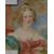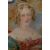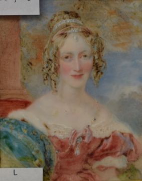 19th century miniature portrait on porcelain 'Lady Sailsbury' depicting a young woman in pale tones, attributed to Miers portrait painter London and titled verso, within gilt slip and moulded gilt frame, under glass, 7.5cm x 9.5cm & 12.5cm x 14.5cm overall.