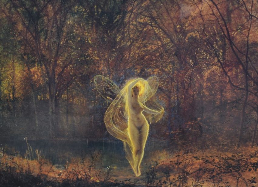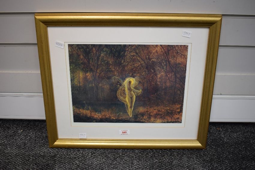 After John Atkinson Grimshaw (British 1836 - 1893) Lithograph 'Dame Autumn has a Mournful Face', depicting glowing fairy figure in orange woodland, within stepped card mount and gilt frame, under glass 28.5cm x 38.5cm & 46.5cm x 56cm overall.