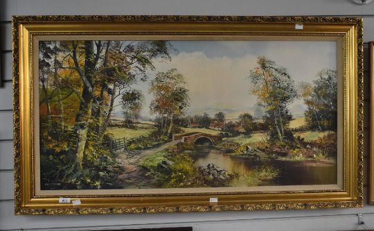 John Corcoran (British b.1940) oil on canvas, a bridge over a stream leading to a village in Autumn, signed lower left, within canvas mount and moulded gilt frame, 49cm x 99cm & 64.5cm x 115cm overall.