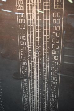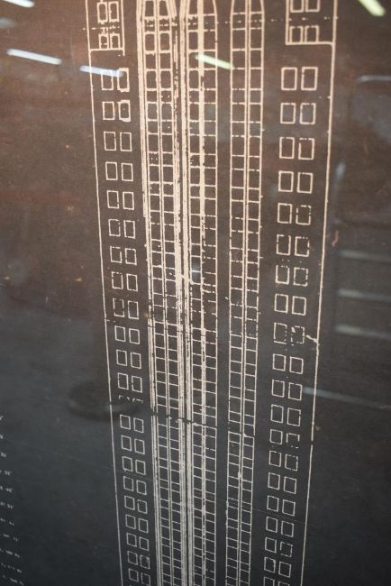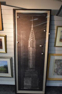 Reproduction of architect William Van Alen's original blue prints for the Chrysler Building in Manhattan New York bought by the vendor from Restoration Hardwear USA, within applied canvas black tray frame, under perspex 63cm x 189cm & 79cm x 209cm overall.