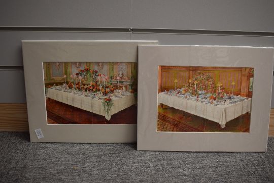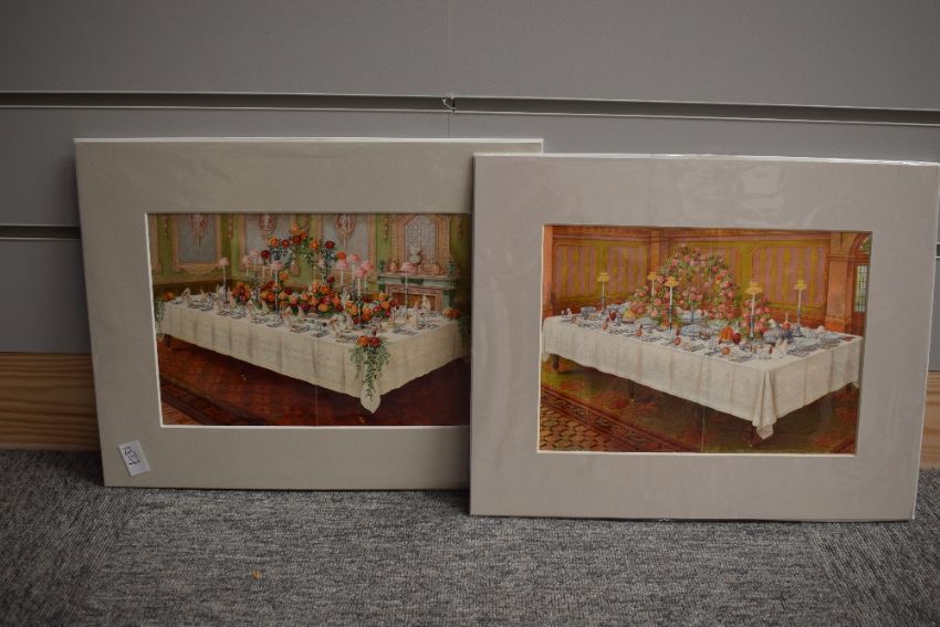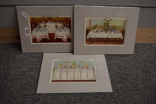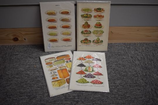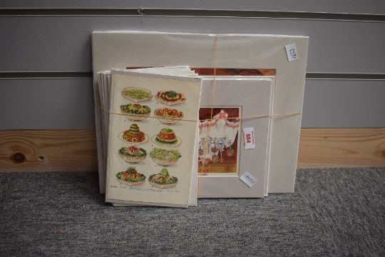 A group of eleven coloured chromolithographic prints, taken from Mrs Beetons All About Cookery c1905, four larger with card mounts, unframed, largest 27cm x 34cm overall.
