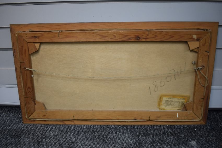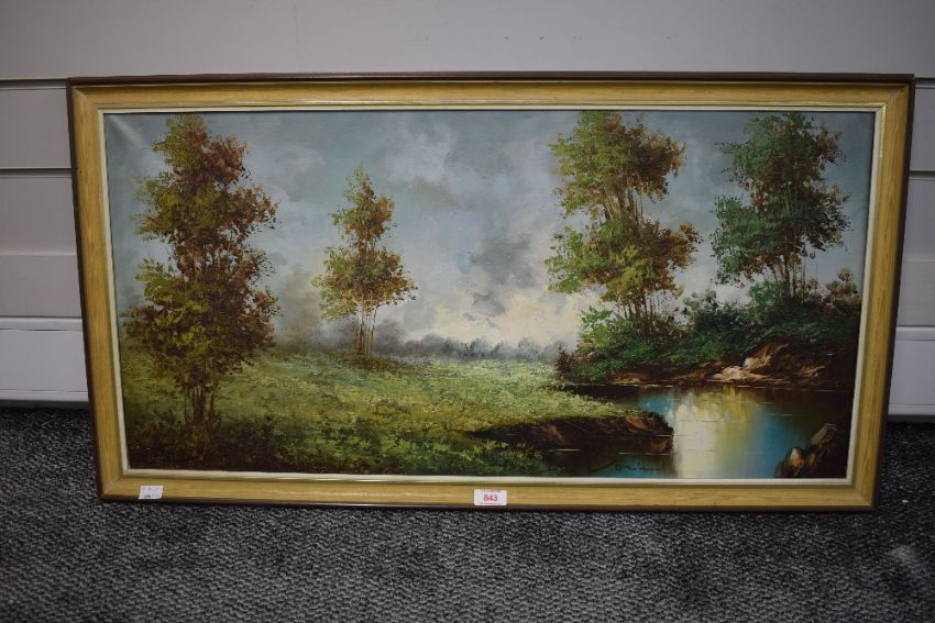 Alfred Dorini* (Italian 20th Century) oil on canvas, an attractive scene depicting dark skies and trees beside a lake, signed lower left, attribution and biography verso, within moulded frame, 80.5cm x 40.5cm & 88cm x 47cm overall. *Biography attached attributes painting to 'Alfred Dorini' but could possibly be Augustus Dorini