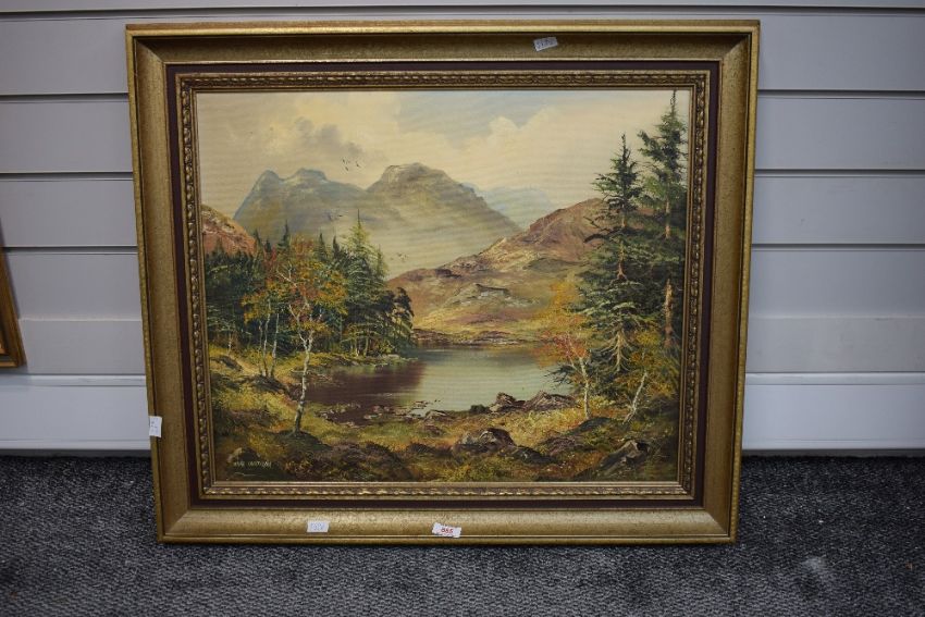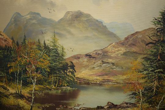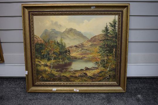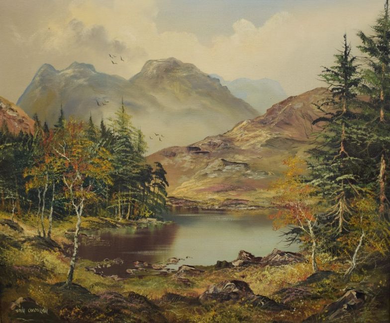 *Local Interest* John Corcoran (British b.1940) Oil on canvas 'Blea Tarn', a view of the tarn looking towards the Langdale Pikes in Corcoran's distinctive style, signed lower left, title to upper canvas verso, within moulded gilt frame, 59cm x 49cm & 75.5cm x 65.5cm overall.
