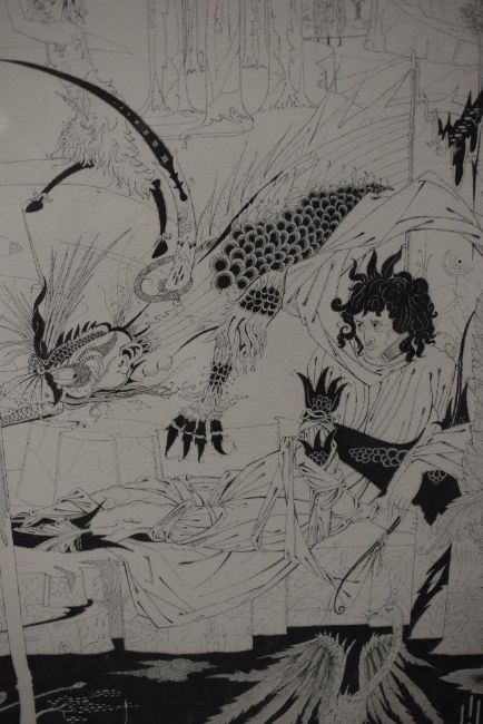 After Aubrey Beardsley (British 1872 - 1898) Special limited edition print 'King Arthur and the Questing Beast' , one of the 1893 book illustrations for Le Morte D’Arthur by Sir Thomas Malory, titled and numbered (45/100) in ink to lower left margin with printed signature to lower right and painting description verso, under glass 39.5cm x 47cm & 43cm x 51cm overall.