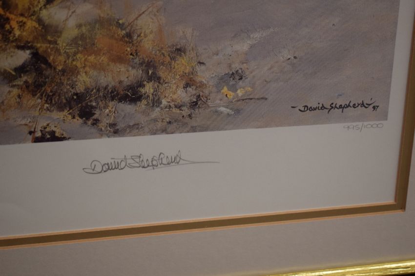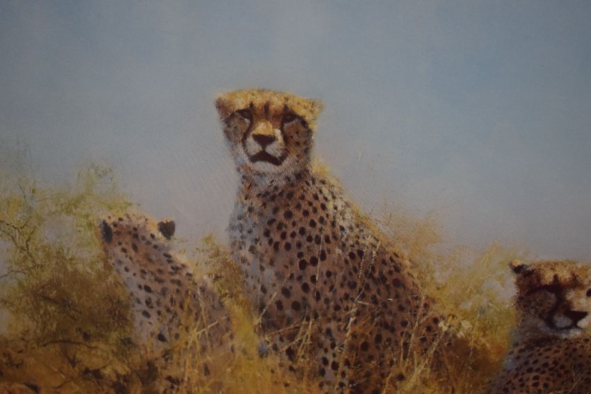After David Shepherd (British 1931 - 2017) Limited edition 'The Cheetahs of Nambia', depicting a coalition of cheetahs in brush, further illustration of cheetah to left margin title and attribution to centre signed and numbered in pencil to lower right (995/1000), within stepped card mount and moulded frame, 70cm x 37cm & 91.5cm x 63.5cm overall.