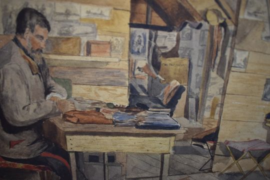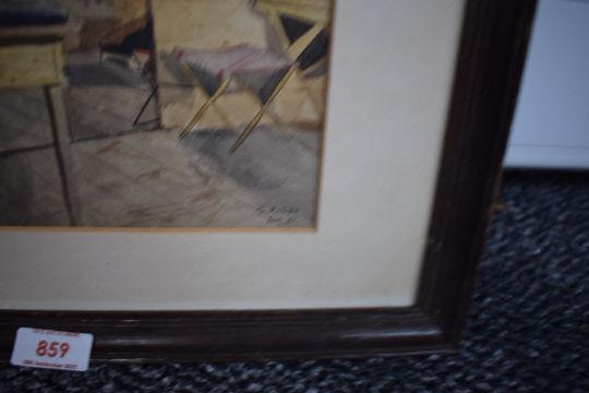 *Local Interest* Cuthbert Rigby (British 1850 - 1935) Watercolour, a self portrait working in his studio, signed and dated (1887) to lower right, within card mount and wooden frame, 26.5cm x 21cm & 41.5cm x 34.5cm overall.