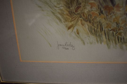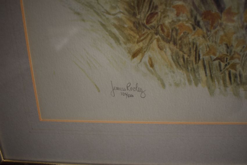 After James Rowley (British contemporary) limited edition print of a spaniel in reeds beside a stream, signed and numbered (333/850) in pencil to lower left, within washline mount and moulded frame, under glass 52cm x 40cm & 69.5cm x 58.5cm overall