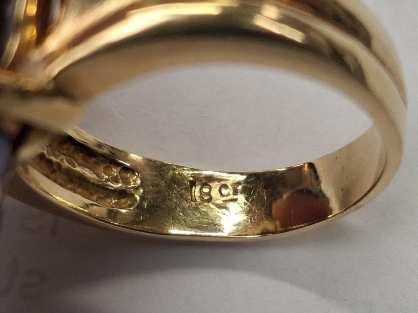 A yellow metal garnet ring stamped 18ct, the large oval garnet being in a four claw raised mount to moulded shoulders on a yellow metal loop stamped 18ct, size S/T & approx 13.5g