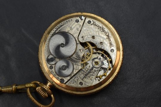 A gold plated top wound open face Elgin pocket watch, the white dial having Arabic numerals and subsidiary dial, having scroll decoration to the case with engine turned decoration and a shield engraved 'AOL', the case numbered 5588070, the movement 10400585, along with a yellow metal watch chain, 107.3g gross. Some cracks to the dial