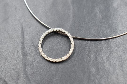 An 18ct white gold diamond set circular pendant, the open pendant set with thirty-four round brilliant cut diamonds, measuring approximately 2ct total diamond weight, on an 18ct white gold snake link chain, both marked 750, 14g gross