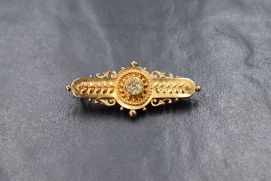 An 18ct gold diamond set bar brooch, the central old cut diamond within a decorative twisted rope setting, with bead and scroll work to the sides, 4.7g