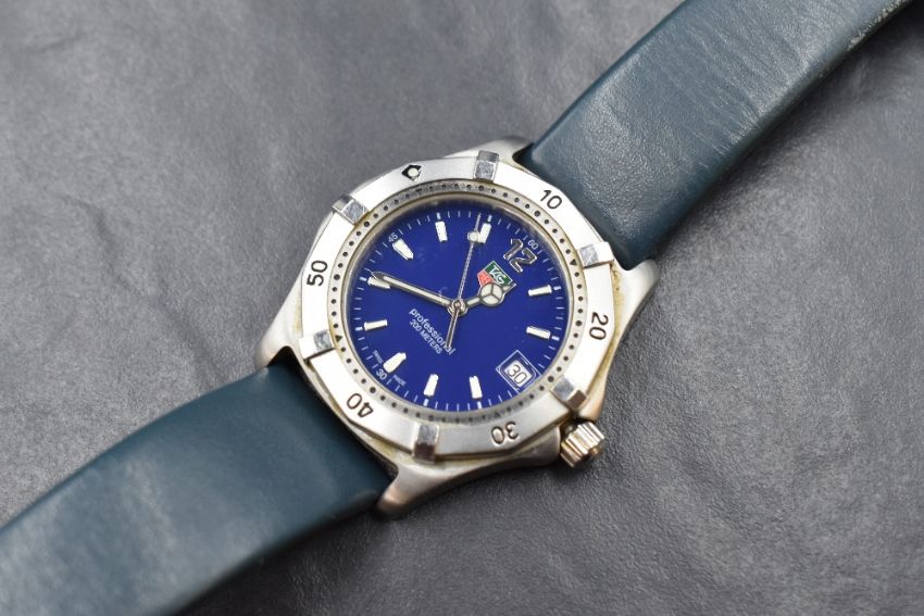 A Tag Heuer Professional wristwatch, the navy blue dial having baton and Arabic numerals with date aperature, numbered WK1113-0 and VK1959 to reverse, on a teal leather strap