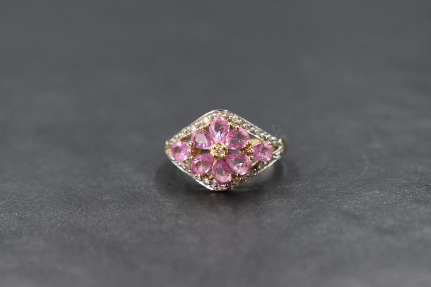 A 9ct gold pink sapphire cluster ring by QVC, having a central daisy cluster within a border having diamond chip decoration, all on a 9ct gold loop, size O & approx 2.8g
