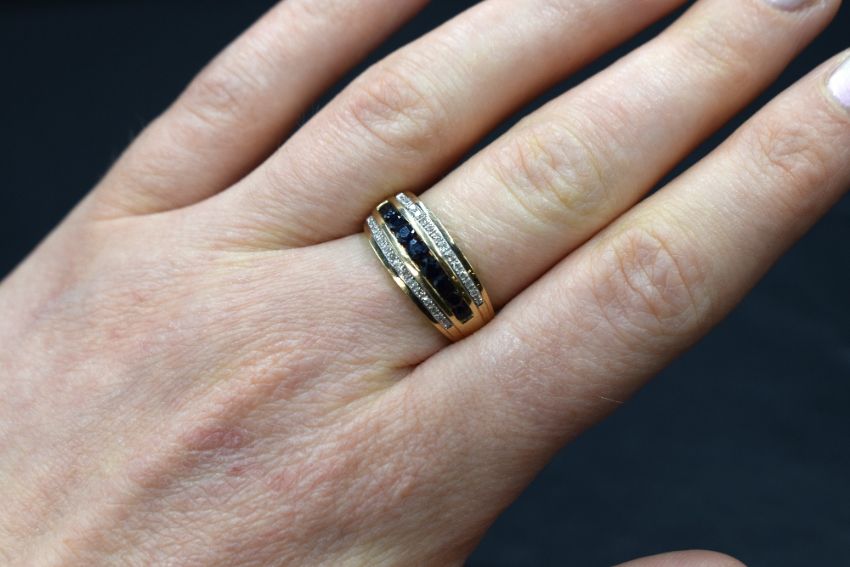 A 9ct gold sapphire and diamond set band, the central row of nine graduated sapphires in a pressure setting, flanked by a row of diamond chips to each side, marked 375, ring size M-N, 3.3g