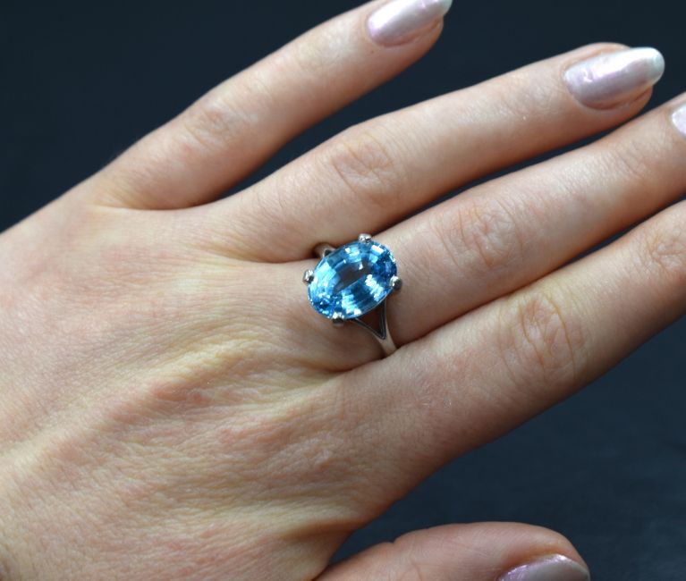 An 18ct white gold blue topaz ring having a large oval cut stone, 14mm x 10mm, in a four claw raised mount to split shoulders on an 18ct white gold loop, size R & approx 8.6g