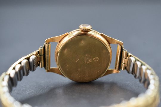 A vintage 18ct gold wrist watch by Heurlux, having baton & Arabic numeral dial with subsidiary seconds on a white face in a gold case on a gold plated stretch strap, approx 17.8g gross, watch not working
