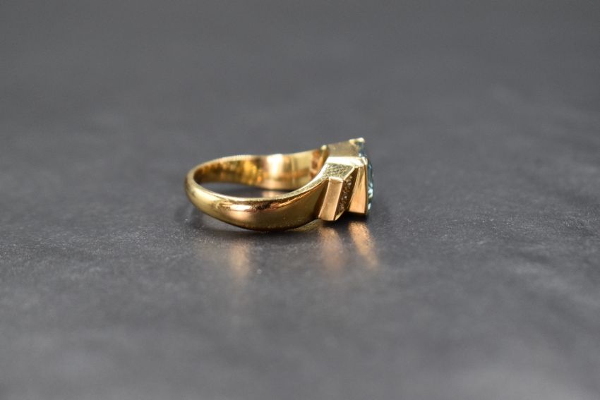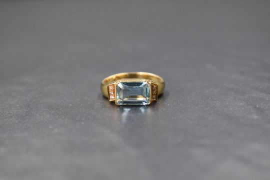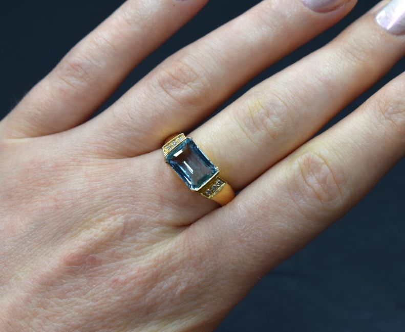A yellow metal aqua marine and diamond ring having a central emerald cut aqua marine of approx 2ct in a collared mount with diamond set shoulders on a yellow metal shaped loop stamped 750, size N & approx 7.2g