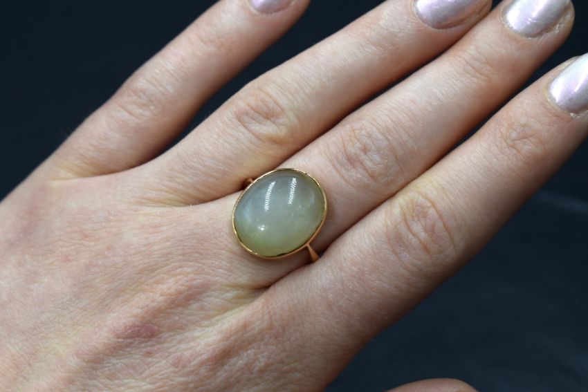 A 15ct gold cabochon possibly chrysoberyl set ring, the pale yellow-green cabochon displaying chatoyancy in a bezel setting, marked 15ct, ring size P, 4.5g