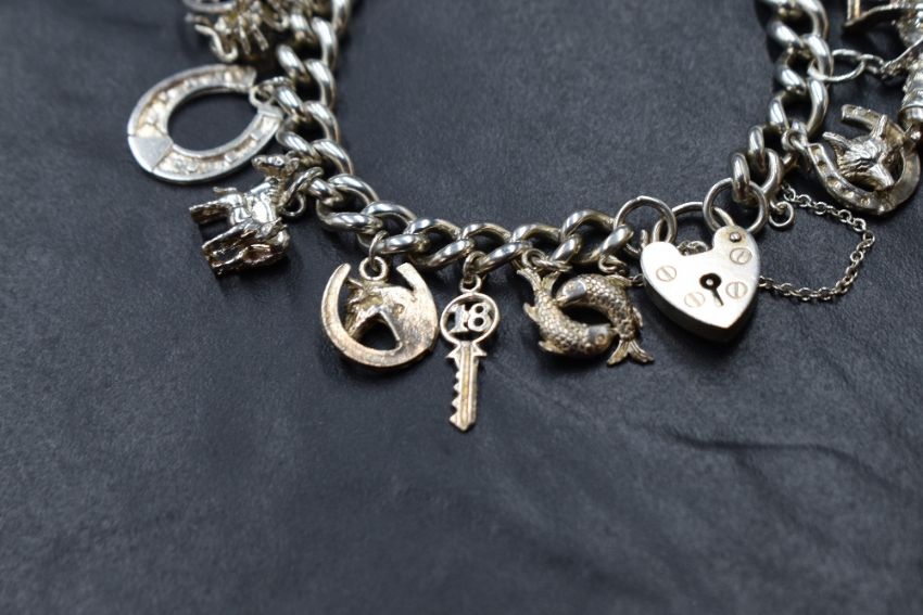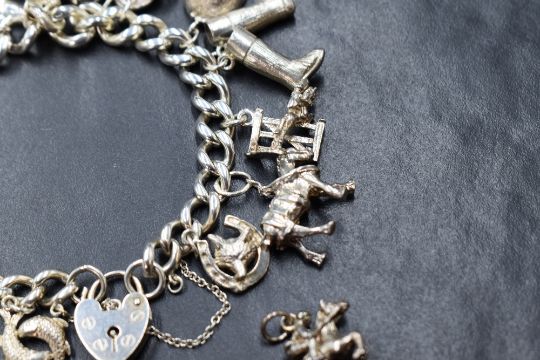 A silver curb link charm bracelet, having eighteen charms including a spider, a double fish, riding boots and various horse related charms, with a silver heart padlock and safety chain, marked silver, 63g. One charm loose