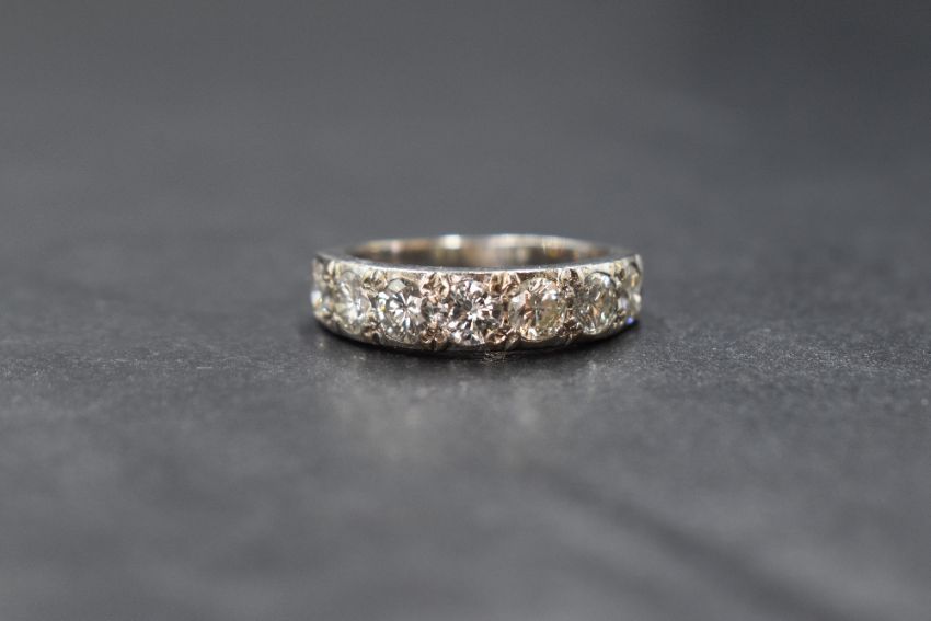 A white metal, presumed 18ct white gold, seven stone diamond half eternity ring, each brilliant cut diamond approx 0.25ct in a pave setting ona white gold loop, no marks, size M/N and approx 4.4g, some wear to the loop