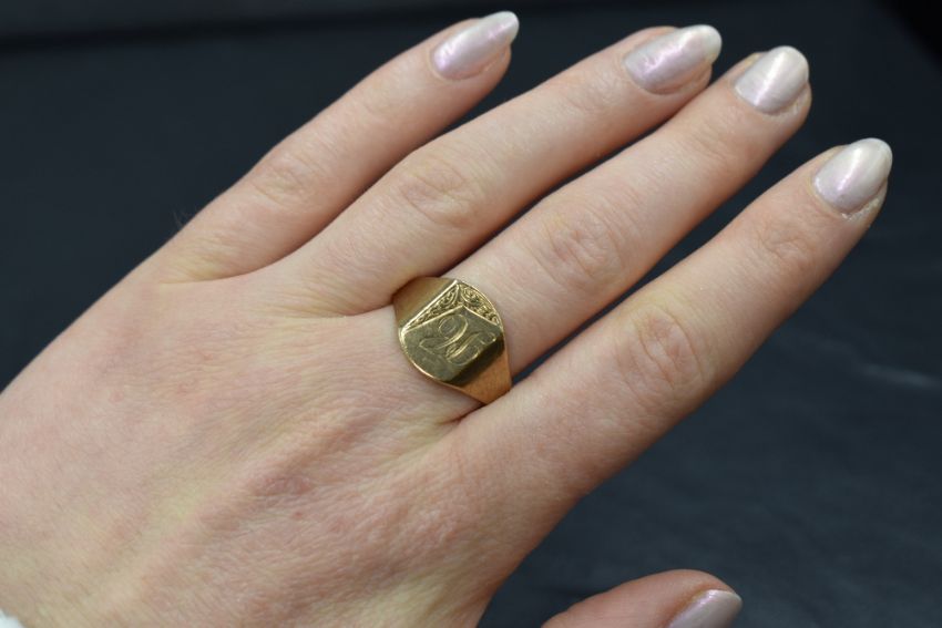 A 9ct gold signet ring, the rectangular panel having 'PC' monogram and scroll engraving, marked 375, ring size T, 5.2g