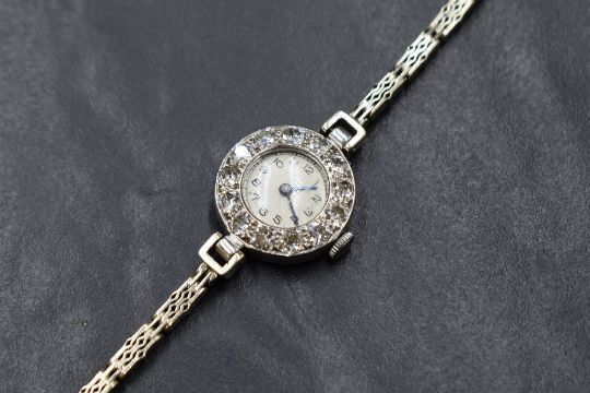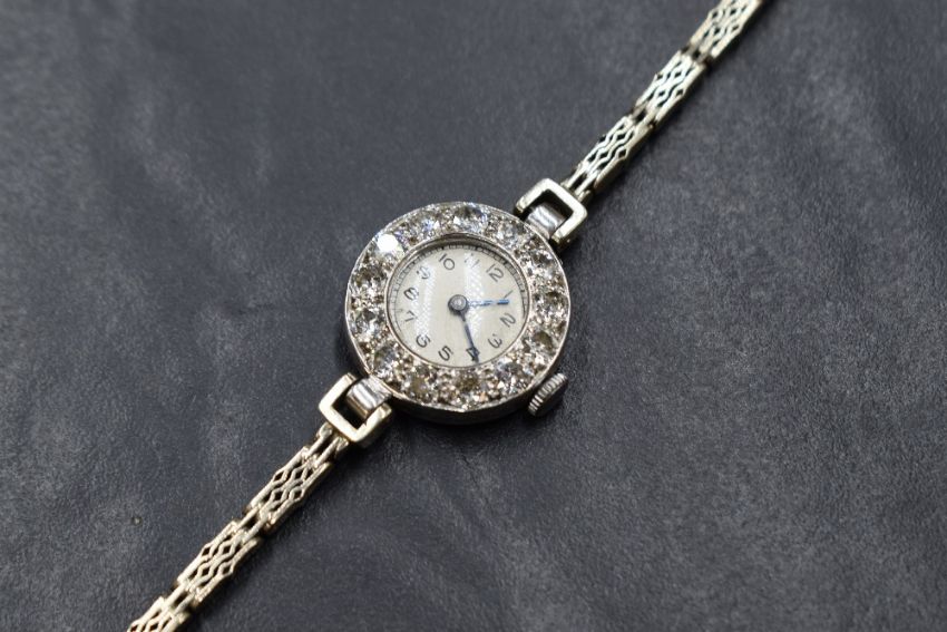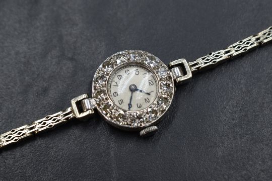 An Art deco platinum & diamond mechanical cocktail watch with 9ct white gold bracelet strap, the watch having a Swiss movement with Arabic dial to small white face within a decorative platinum case with diamond set bezel having thirteen old cut diamonds totalling approx 3.33ct in a milligrain setting, on a later 9ct white gold articulated decorative link bracelet strap, approx 185mm long & 17.9g gross, diamonds bright and fairly clear, watch not working and glass scratched