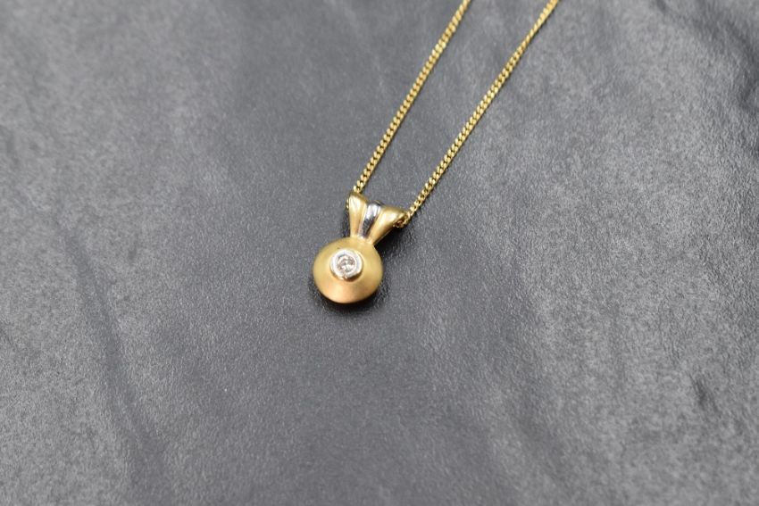An 18ct white & yellow gold diamond solitaire pendant, the brilliant cut diamond of approx 0.05ct in a collared setting in a brushed 18ct white and yellow gold circular mount on a 17' 18ct gold curb link chain, approx 4.9g