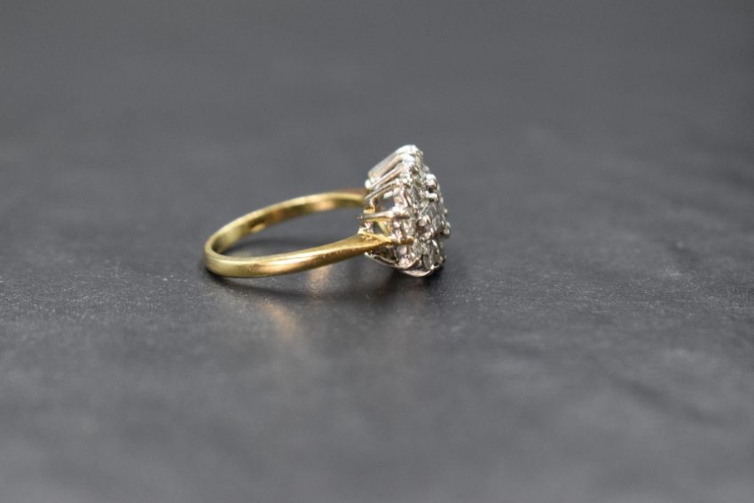An 18ct gold diamond cluster ring having a vertical set baguette cut diamond between two further horizontal set baguette cut diamonds and surrounded by fourteen small brilliant cut diamonds, total weight approx 1.1ct. All in a claw set basket mount to knife blade shoulders on an 18ct gold loop, size M & approx 5.7g