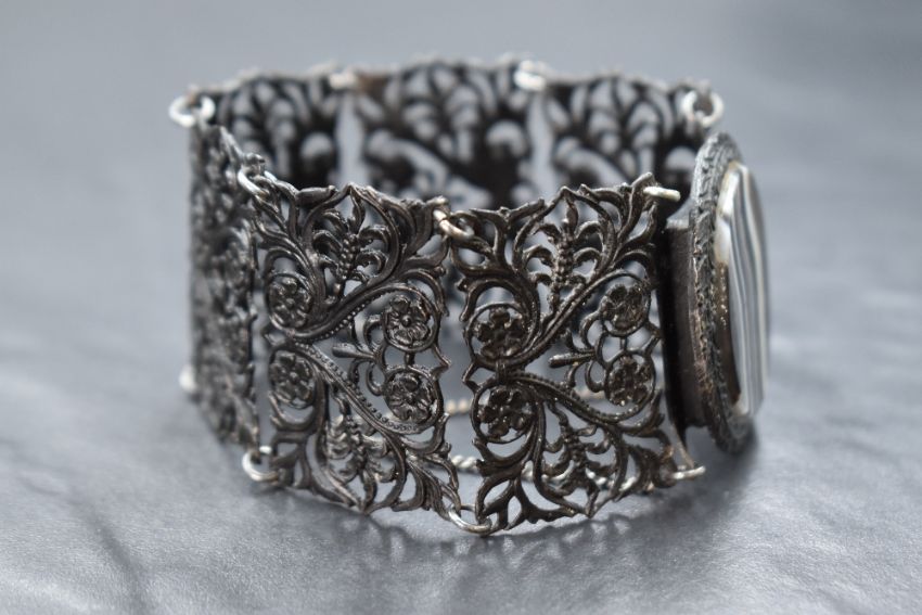 A Victorian Berlin Ironwork bracelet made up of six pierced floral decorative panels with an oval striped agate mounted box clasp, approx 180mm long