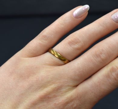 A broken yellow metal wedding with worn marks, tests as 18ct gold, approx 2g