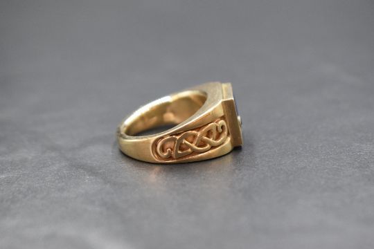 A 9ct gold lapis lazuli and sapphire set signet ring, the square lapis lazuli panel having an inset round cut blue sapphire to the corner, with engraved Celtic designs to the shoulders, designed by Kathryn King, marked 9ct, ring size R, 18g