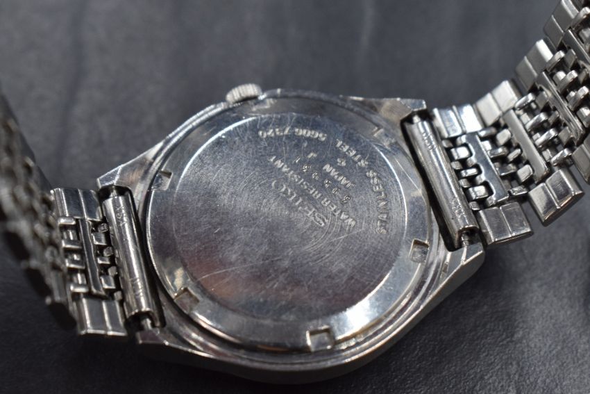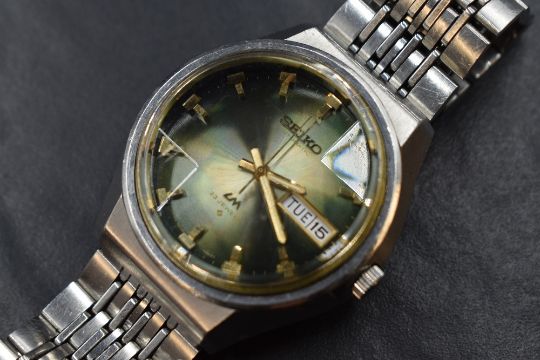 A gent's 1970's Seiko LORD MATIC green dial automatic wrist watch no: 5606-7320LM having a gold coloured baton dial and date aperture to green face under a cut glass in a steel case, no; 395931 on a steel bracelet strap, watch ticks when moved, not tested for functionality