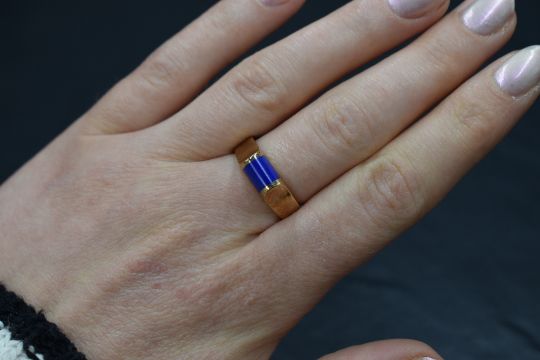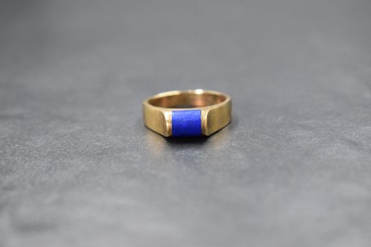 A 9ct gold lapis lazuli set ring, the central domed rectangular lapis lazuli panel in a raised pressure style setting, marked 375, ring size N, 5.3g