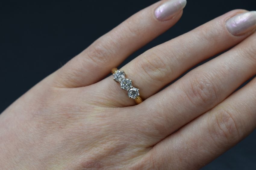 An 18ct gold diamond trilogy ring having three brilliant cut diamonds, approx 1ct total in a claw set white gold mount on an 18ct yellow gold loop, size K & approx 3.9g, all stones good colour but all bearing inclusions under a loupe