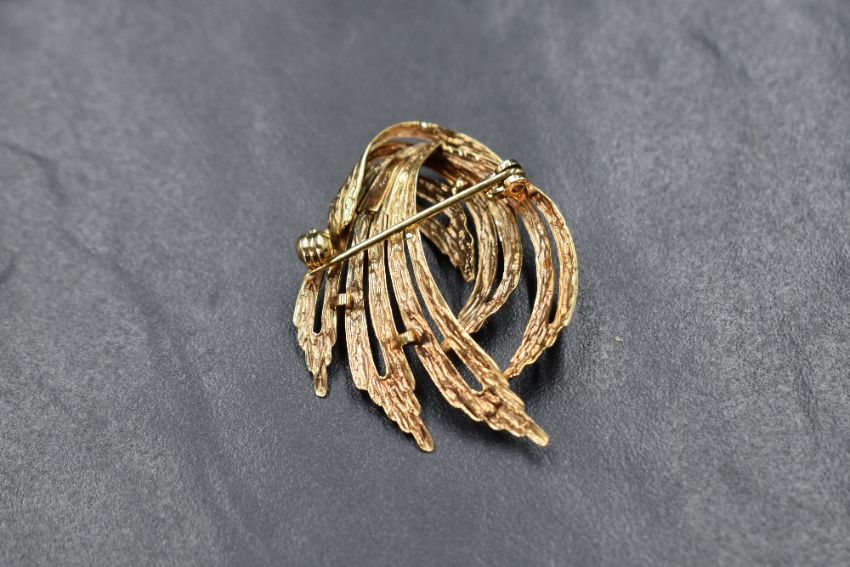 A yellow metal stylised brooch stamped 9ct of open swirl form, approx 4g