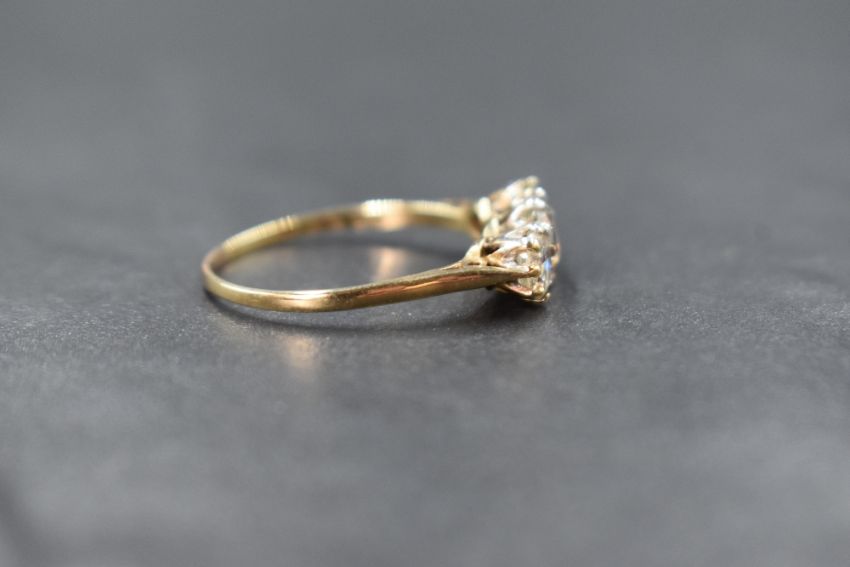 A 9ct gold cubic zirconia set three stone ring, the central cubic zirconia measuring approximately 0.75ct, flanked by two cubic zirconia measuring approximately 0.33ct each, marked 375, ring size U, 2.6g