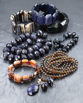 A stackers jewellery tray containing a small selection of modern costume jewellery including blue sandstone beads, pendant, stretch bracelet, chorded bracelet and earrings, two polished stone stretch bracelets, a green sandstone style stretch bracelet and a hematite and bead necklace
