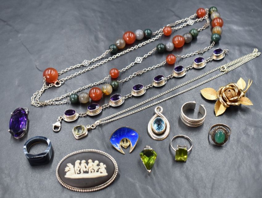 A selection of modern silver and white metal jewellery including a silver gilt rose brooch, single Norwegian enamelled clip earring, Wedgwood black jasper brooch, amethyst pendant with matched articulated bracelet both in silver mounts, a silver chain with inset hardstone/agate beads, carved agate ring, polished stone pendants etc