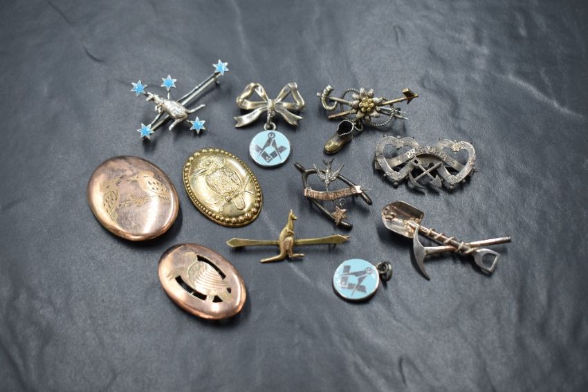 An assortment of silver brooches, including three gold plated silver depicting kookaburras, mining related brooches having shovels and picks and two kangaroo brooches, 38.6g gross