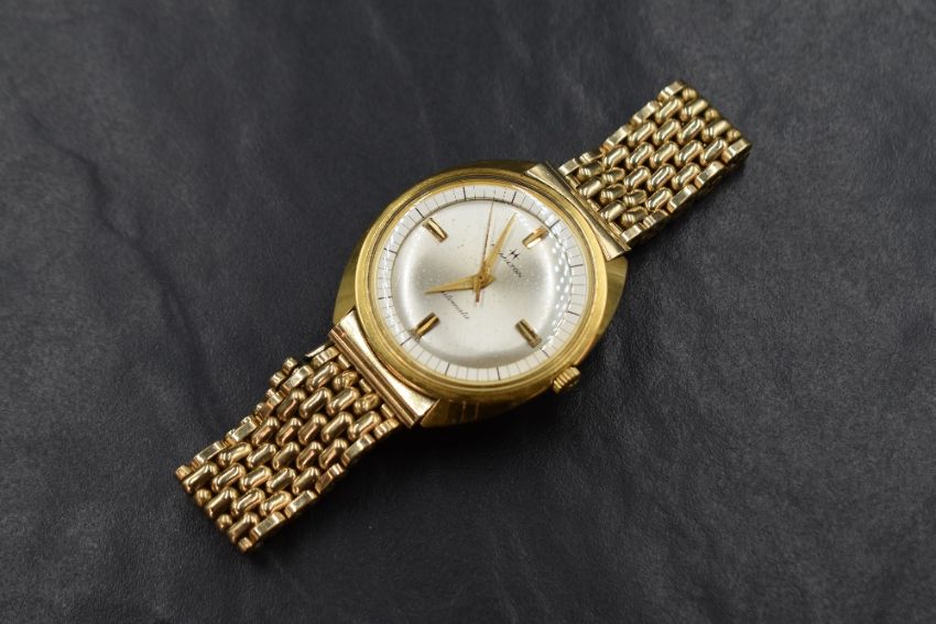 A gent's vintage gold plated Hamilton automatic wrist watch having a baton quarter dial with perimeter minute dial on a pearlised face with a rolled gold brick link bracelet strap, second hand moves when watch moved but we do not test for functionality