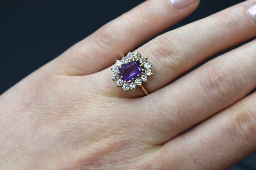 A 9ct gold amethyst and cubic zirconia cluster ring, having a baguette cut amethyst within a surround of CZ in a claw set mount to knife blade shoulders on a 9ct gold loop, size N & approx 3.1g