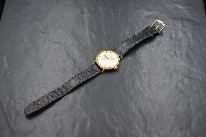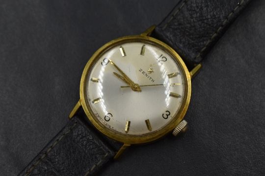 A gent's vintage gold plated Zenith manual wind wrist watch having Arabic numeral and baton dial to pearlised face in plain gold plated case on a black leather strap, watch ticks when wound but not tested for functionality