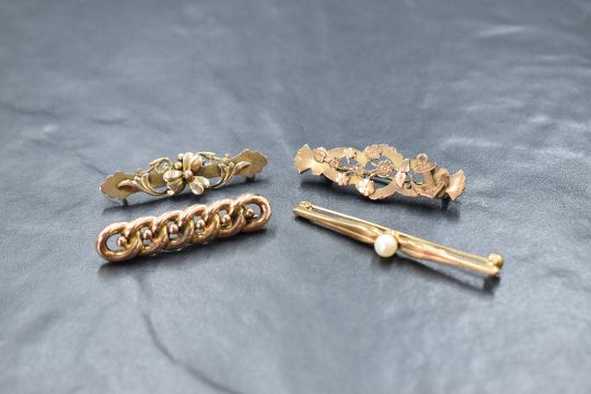A group of four 9ct gold bar brooches, comprising two floral motif brooches, a curb link chain motif brooch and a cultured pearl set brooch, all marked 375 or 9ct, 10g gross