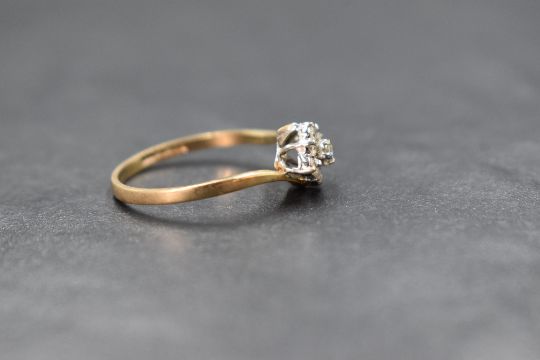 A 9ct gold diamond set cluster ring, the central round brilliant cut diamond in an eight diamond surround in a lozenge design, marked 375, ring size P, 1.6g. One diamond is missing