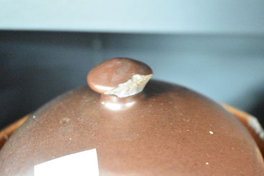 A selection of three 20th-century French-style studio stoneware pottery pieces, including two decorated pitchers and a large glazed pot with damage to its lid, (3).