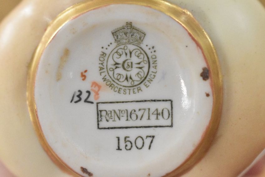 Two Royal Worcester 'Blush Ivory' cream jugs, hand painted with floral designs, h13cm.
