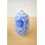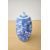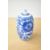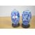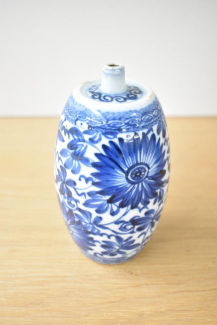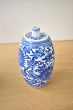 A pair of Chinese porcelain 'spirit' bottles, each of cylindrical form with a tapered, rounded top, decorated with a continuous blue and white floral pattern, and resting on individual wooden bases 17.5cm.