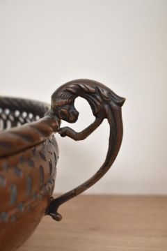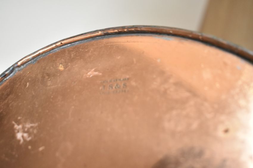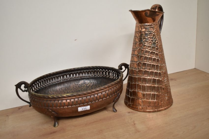 An early 20th Century Joseph Sankey & Sons textured copper jug with faux snakeskin effect finish, marks to base, sold with hammered copper decorative bowl, (2 items).